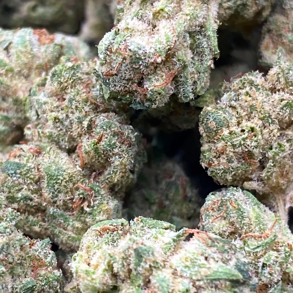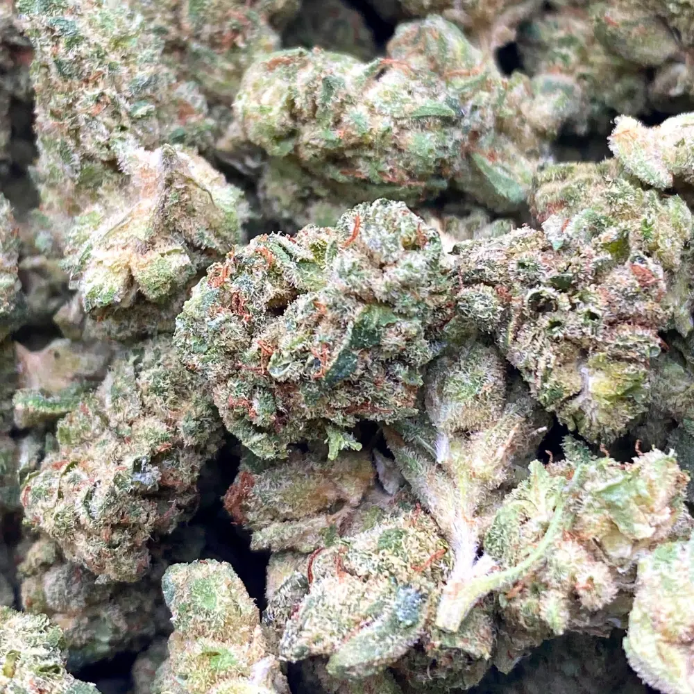 - Visuals: Popcorn-shaped minty green nugs with orange hairs and frosty white trichomes