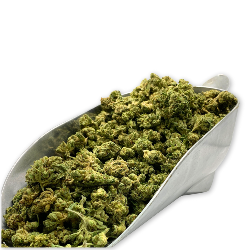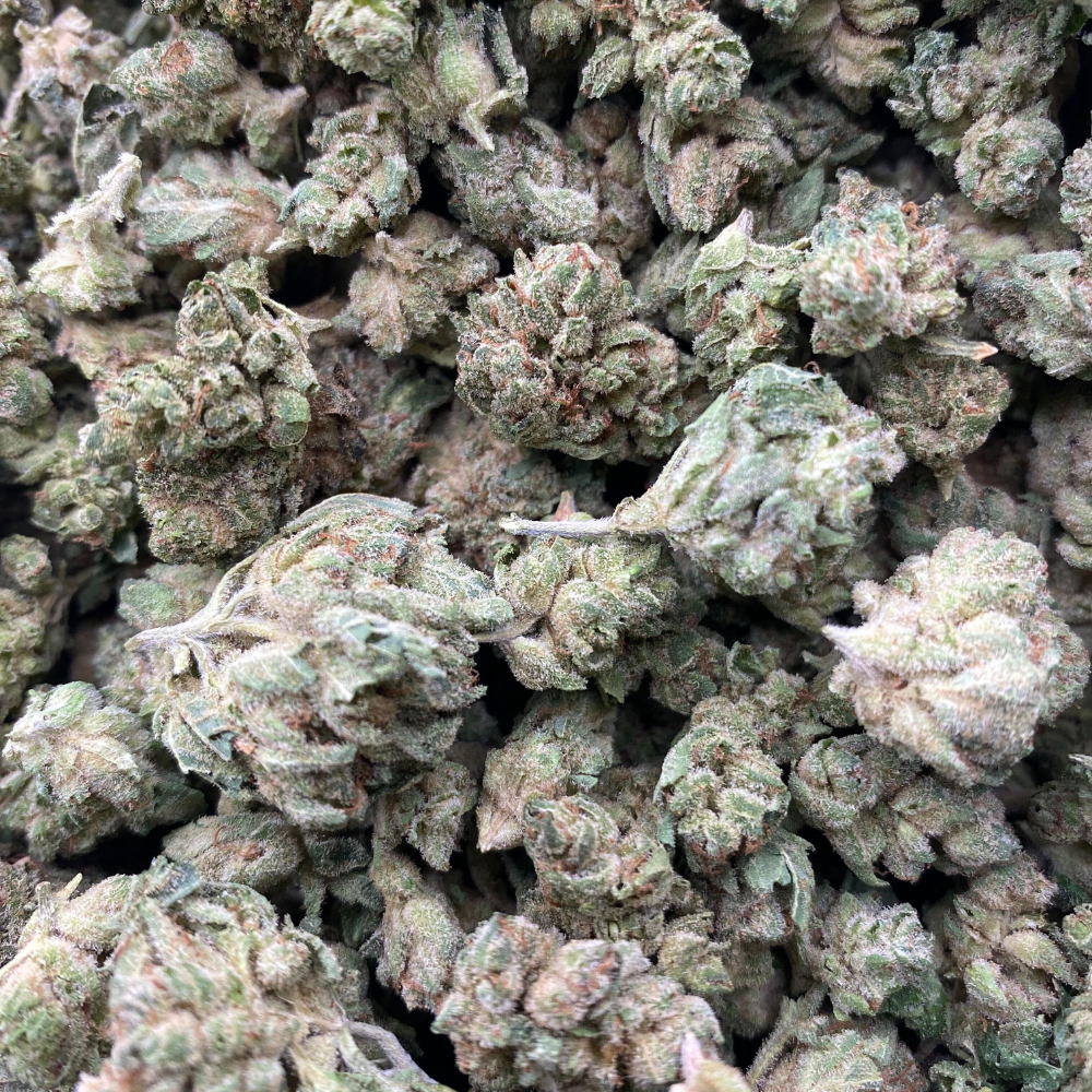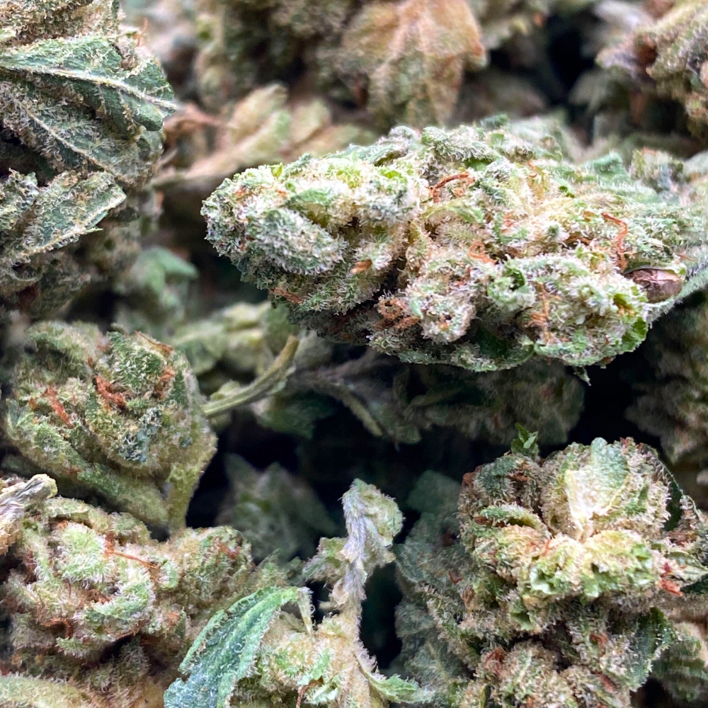 - Visuals: Dense deep green buds with orange pistils and heavy crystalline frost