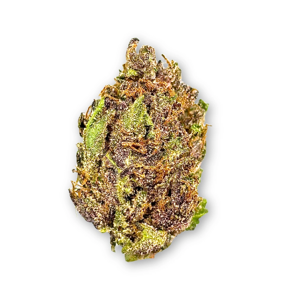 Tropicana Cherry is a slightly sativa dominant hybrid created from Tropicana Cookies and Cherry Cookies. It features a terpene profile centered on sweet and sour citrus, ripe cherry, and earthy undertones, with a pronounced citrus-forward aroma. The buds typically display forest green coloration with purple undertones, accented by amber pistils and a frosty trichome layer.